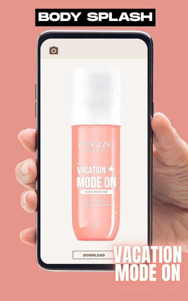 Petrizzio Vacation Mode On Hair & Body Mist 200 ml: aroma frutal tropical con limón, guayaba, frambuesa y coco. Hidrata piel y cabello para llenarte de frescura.