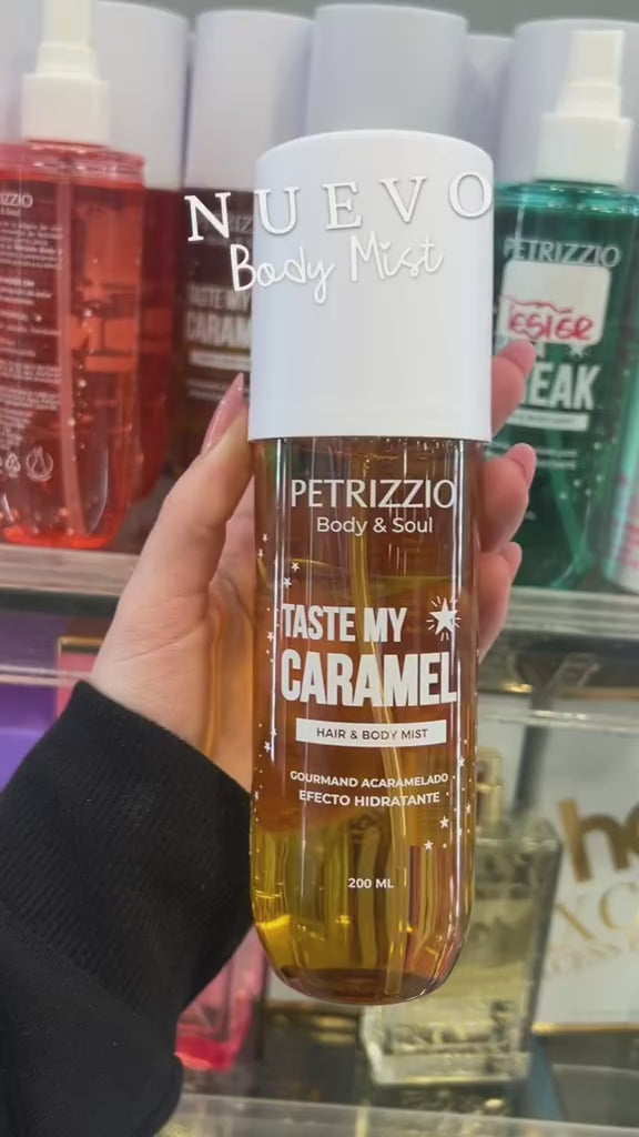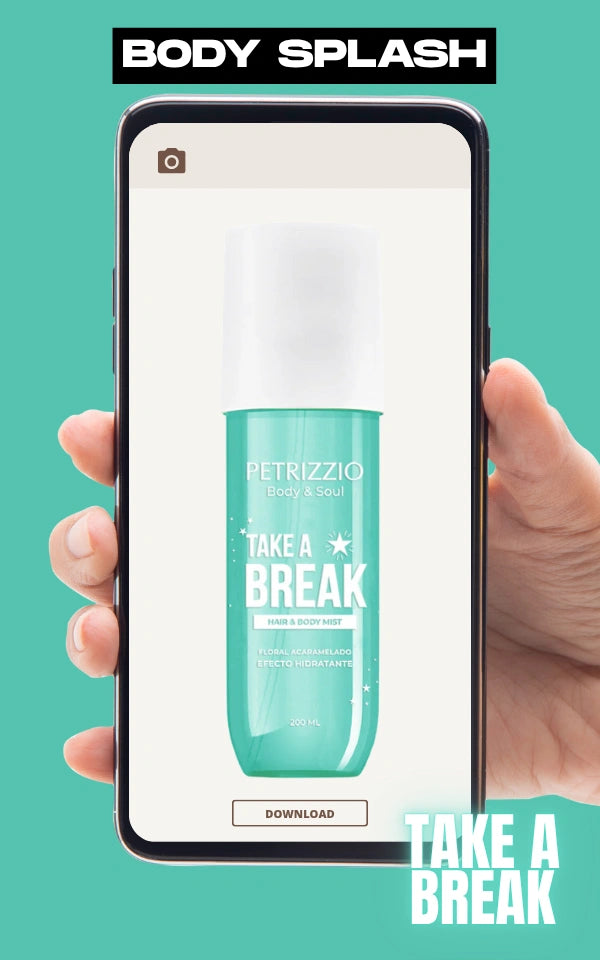 Petrizzio Take A Break Hair & Body Mist 200 ml: fragancia floral acaramelada con lino fresco, jazmín, mimosa, vainilla y ámbar. Hidrata piel y cabello con un aroma elegante y delicado.