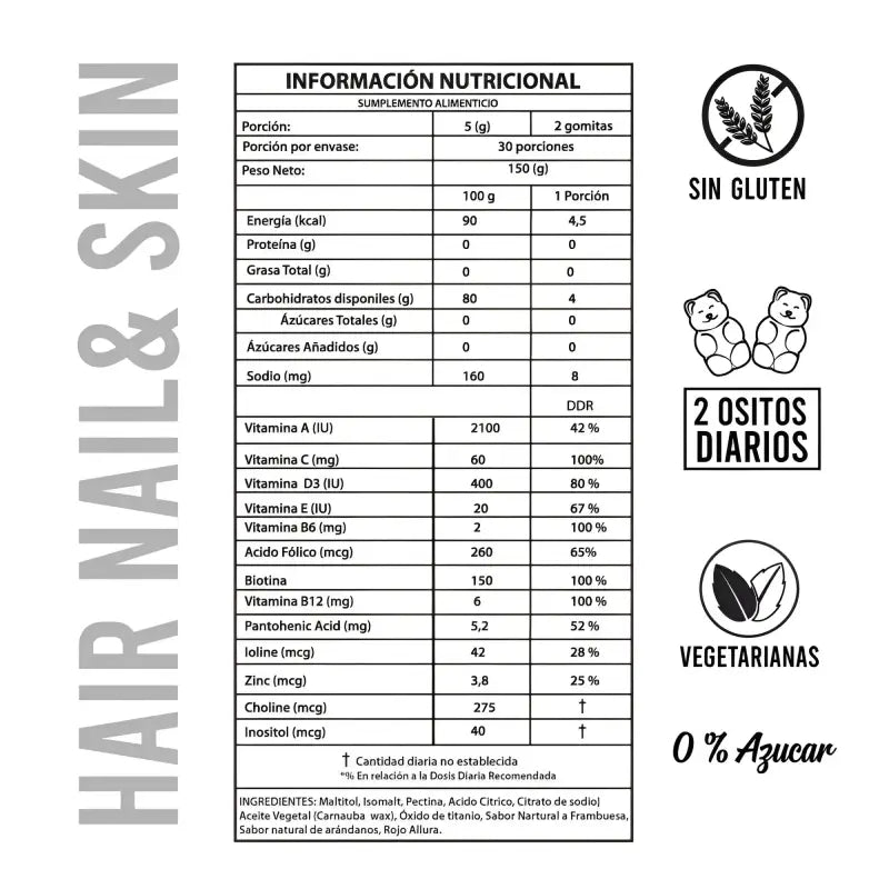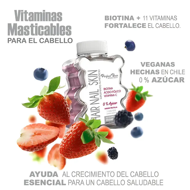 ¡Descubre Hair, Nails & Skin sin azúcar de Perfect Bear!, un osito masticable de exquisito sabor, fortificado con vitaminas. Hair nails skin 0% azúcar es un osito masticable de exquisito sabor, fortificado con vitaminas y minerales 100% naturales, cuidadosamente seleccionadas especialmente para fortalecer tu cabello y uñas, esta vez con una versión sin azúcar, endulzado con maltitol, para evitar alzas de azúcar en sangre y de igual forma obtener todas las vitaminas y minerales de la versión clásica.