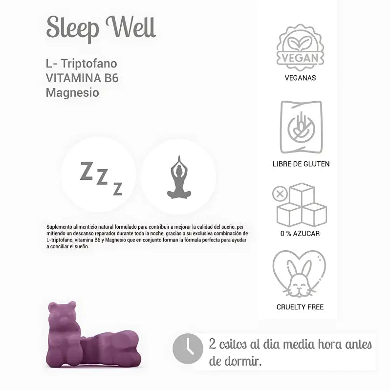 Sleep well provoca un conocido efecto relajante y ansiolítico, mejorando la condición del sueño, producto de la potente combinación de Magnesio junto al L-triptófano.